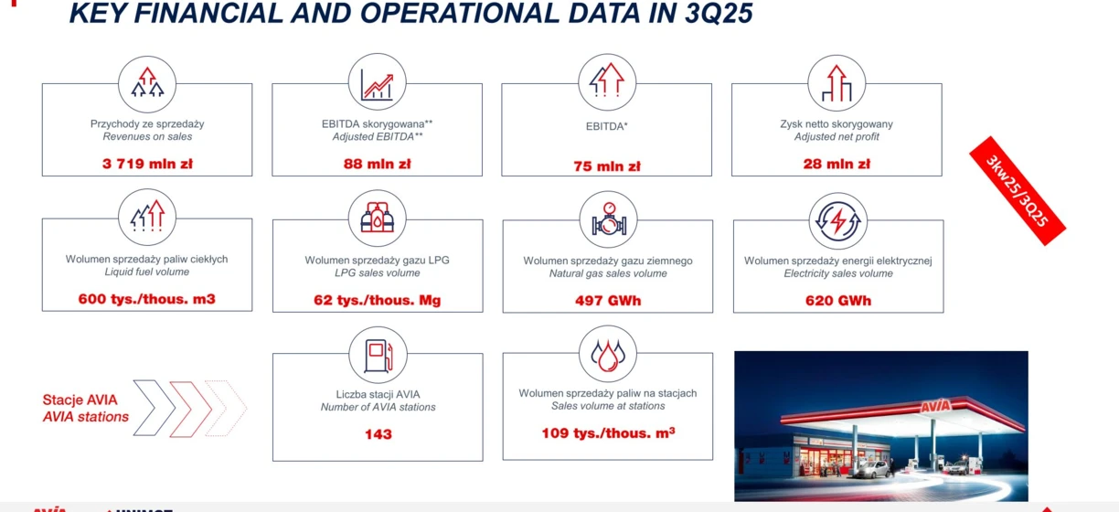 In terms of operating results, in Q3 2025 the Unimot Group generated liquid fuel sales volume of 600 thousand cubic meters, LPG sales volume of 62 thousand tons, natural gas sales volume of 497 GWh and electricity sales volume of 620 GWh. At the end of Q3 2025, 143 stations operated in the AVIA network, and the volume of fuel sold at them amounted to 109,000 cubic meters in the reported period.